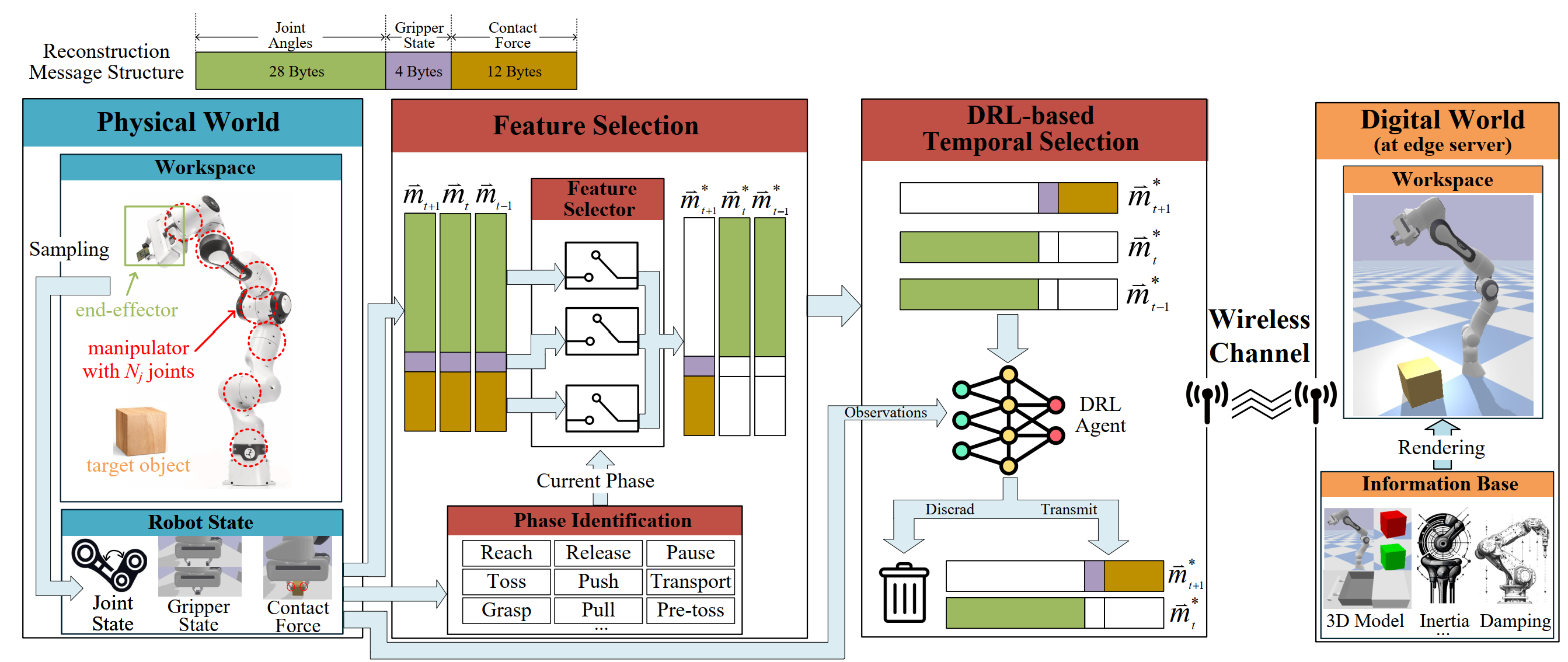 | 3. Goal-oriented Semantic Communication for Robot Arm Reconstruction in Digital Twin: Feature and Temporal Selections Shutong Chen, Emmanouil Spyrakos-Papastavridis, Yichao Jin, Yansha Deng IEEE Journal on Selected Areas in Communications 🤔 Goal-oriented Semantic Communication: "Tranmsit what you need." We implements a feature selection algorithm to extract the semantic information from the reconstruction message, and a deep reinforcement learning-based temporal selection algorithm to selectively transmit the semantic information over time. |