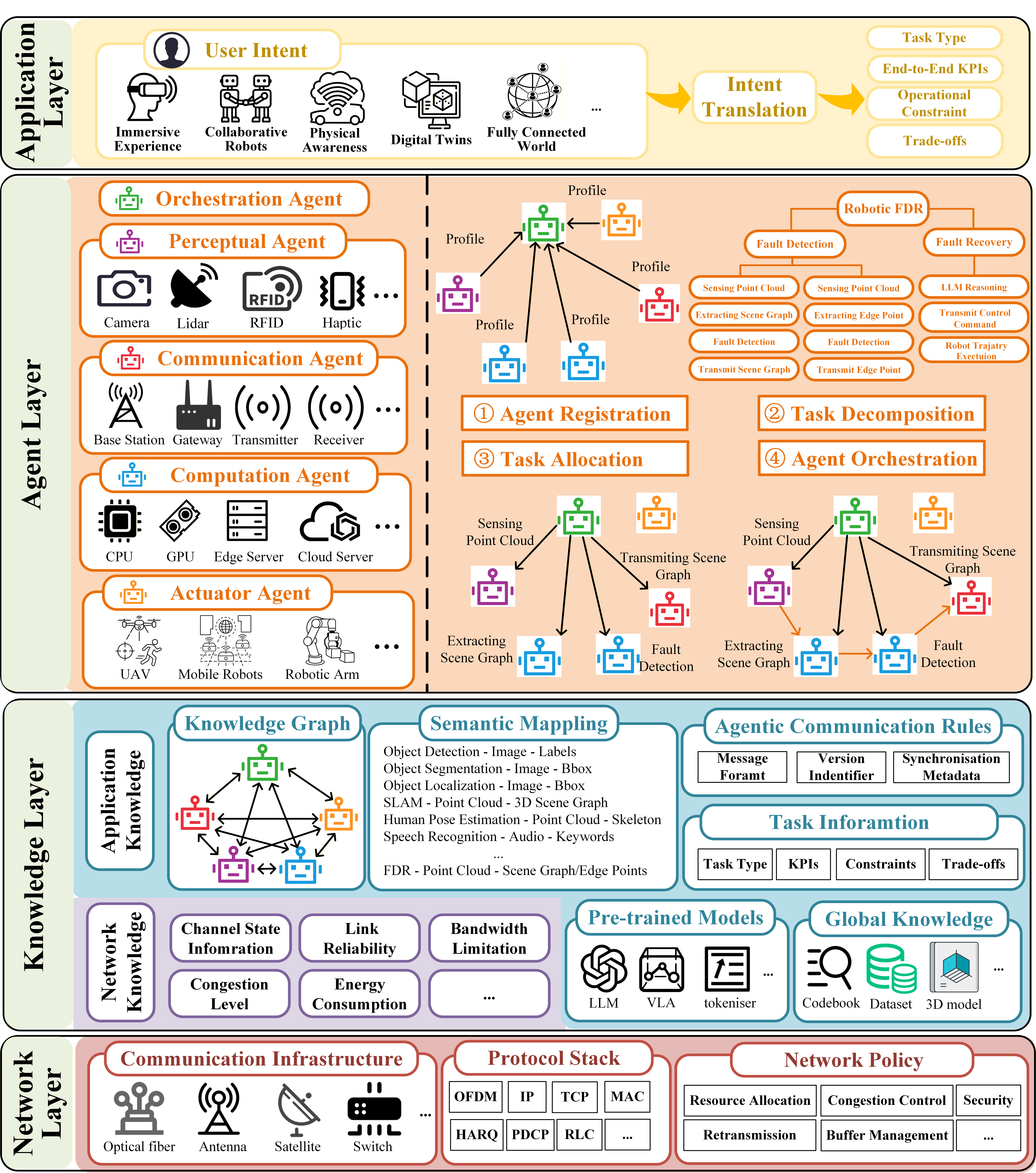 | 1. Goal-Oriented Multi-Agent Semantic Networking: Unifying Intents, Semantics, and Intelligence Shutong Chen, Qi Liao, Adnan Aijaz, Yansha Deng submitted to IEEE for potential publications 🤔 GoAgentNet: "From bit-centric networks to goal-driven agent intelligence." We introduce a new Goal-oriented and Agent-based networking architecture for 6G, which enables applications and the network to collaborate by abstracting their functions into multiple collaborative agents, and jointly orchestrates multi-agent sensing, networking, computation, and control through semantic computation and cross-layer semantic networking, allowing the entire architecture to pursue unified application goals. |